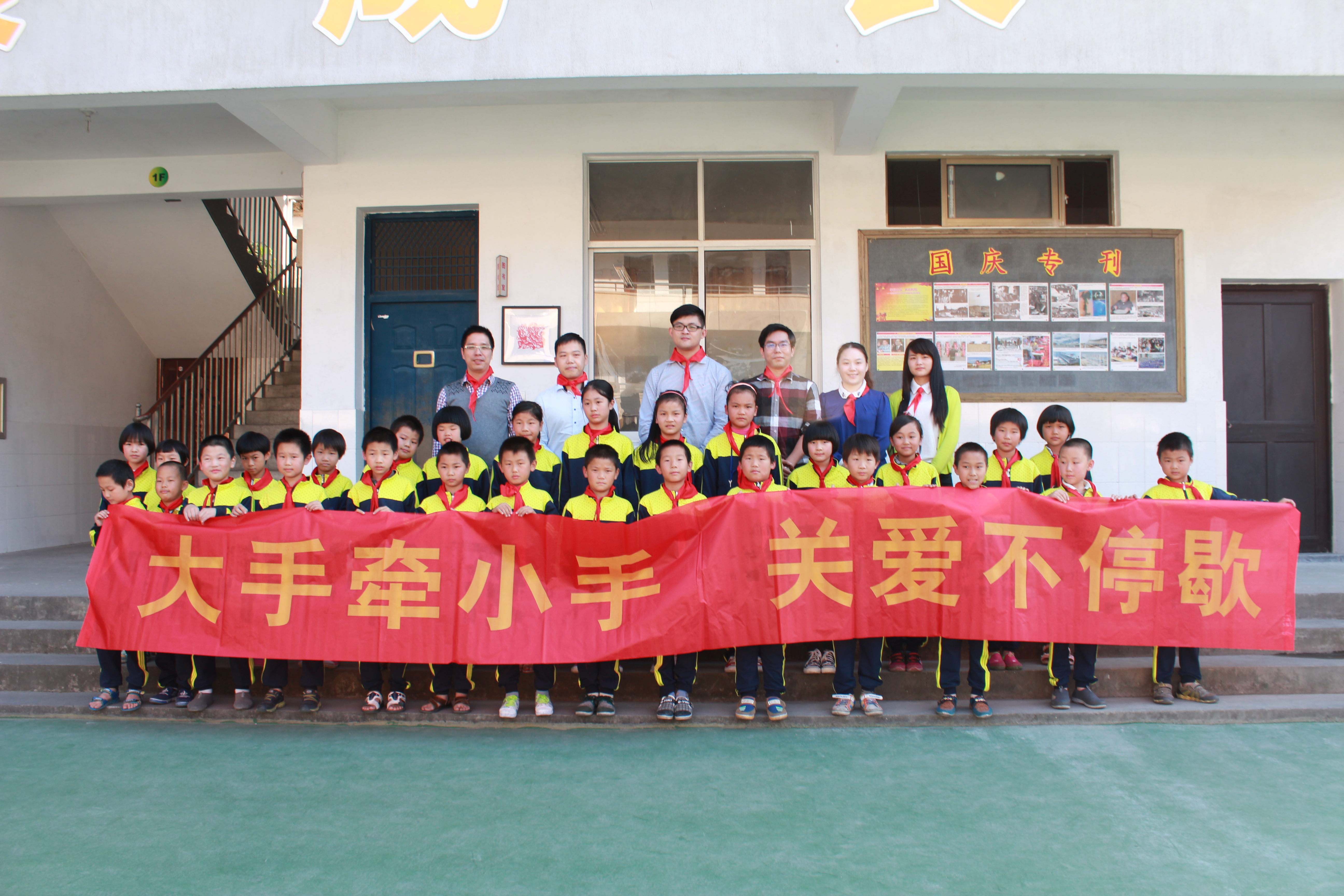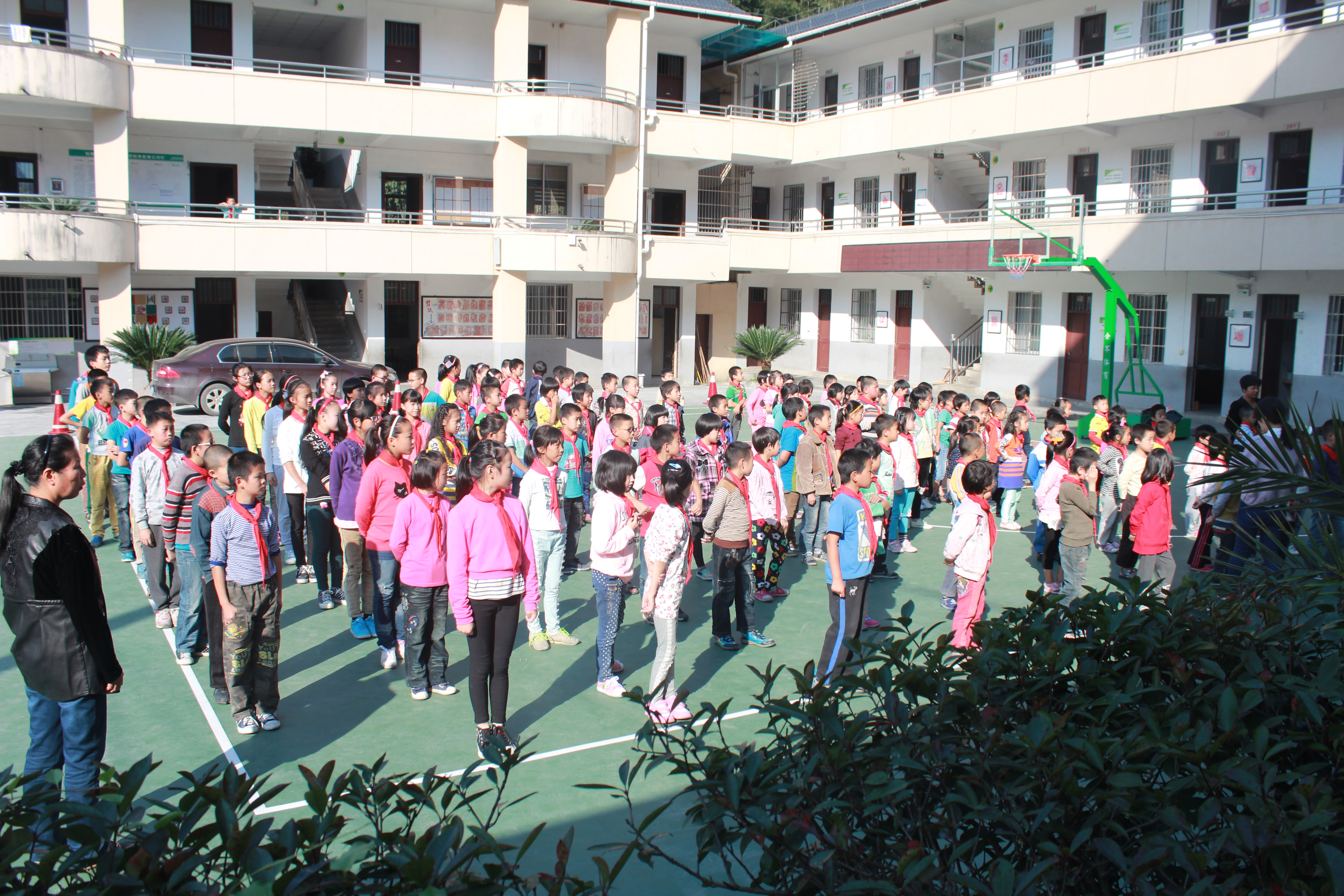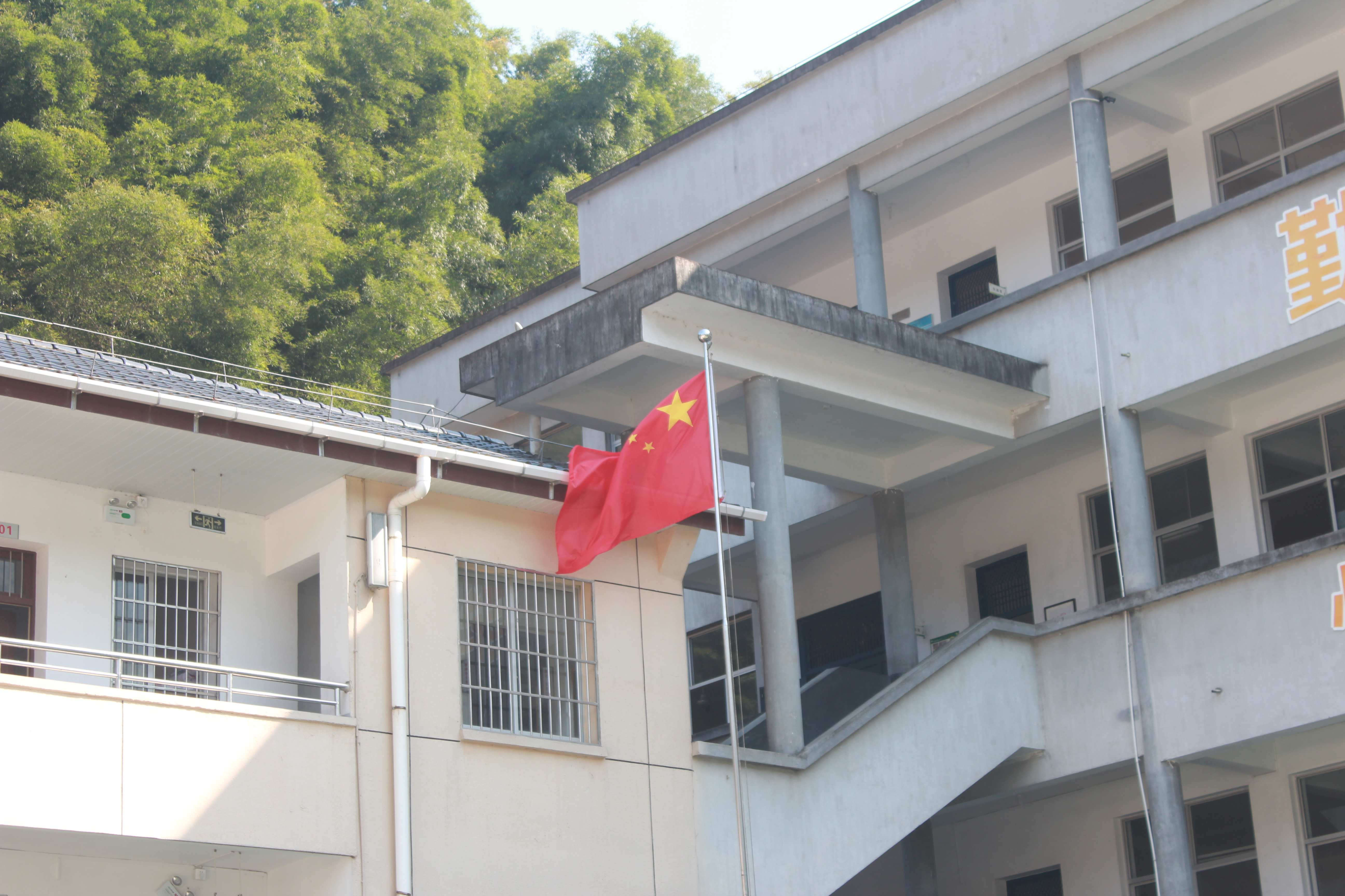 10月14日一早,我們一行人便驅(qū)車從杭州出發(fā),在長(zhǎng)達(dá)3個(gè)半小時(shí)的車程后總算到了麗水市松陽縣。下了高速,在許校長(zhǎng)的帶領(lǐng)下,在蜿蜒曲折的山路上兜兜轉(zhuǎn)轉(zhuǎn)了30分鐘左右便到了此行的目的地——竹源鄉(xiāng)中心小學(xué)。一下車,首先映入眼中的是在風(fēng)中肆意飄揚(yáng)的那面五星紅旗,在綠竹的映襯下顯得格外的鮮紅醒目。