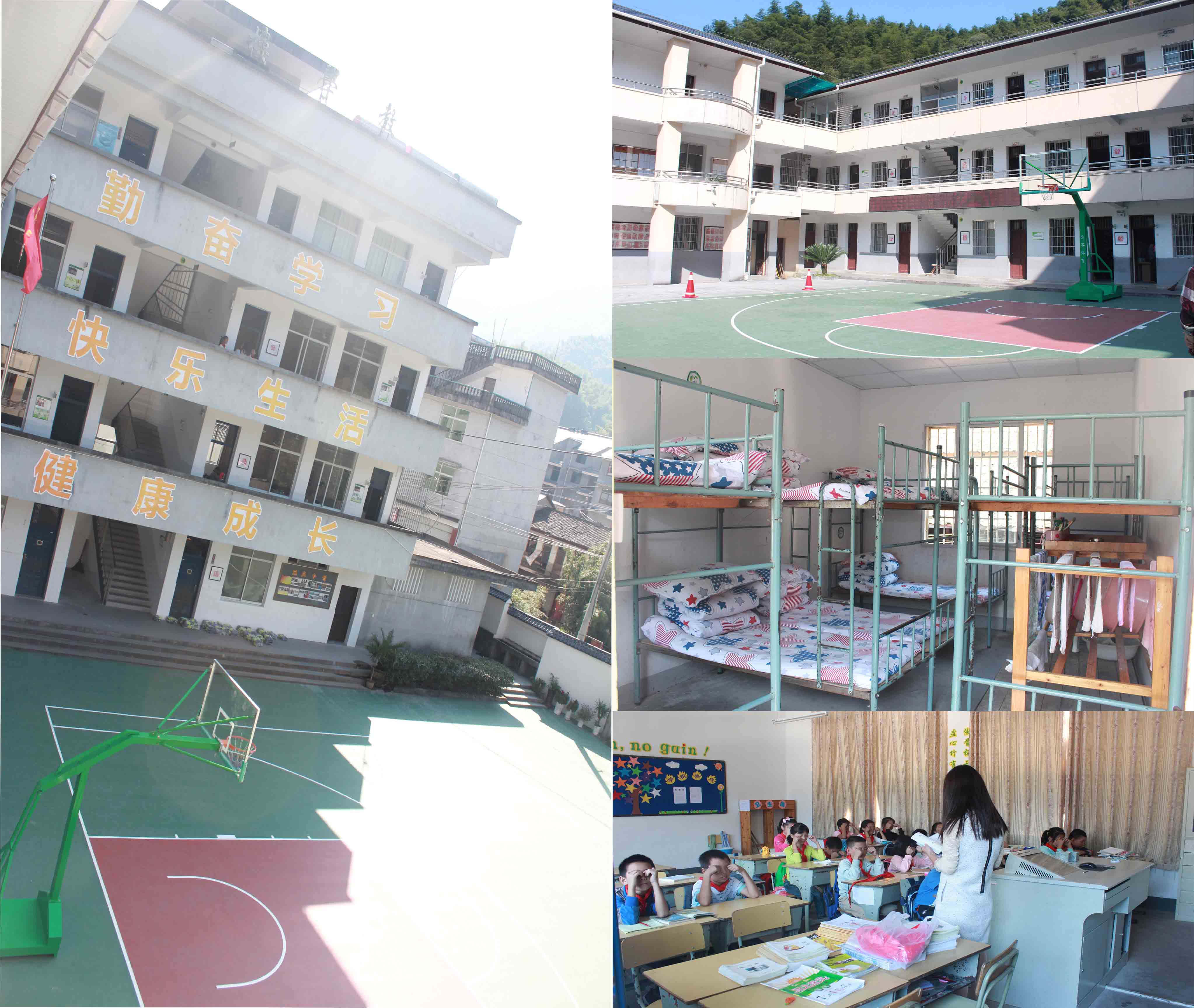 在簡(jiǎn)短的交流過后,許校長(zhǎng)與副校長(zhǎng)帶領(lǐng)我們參觀了學(xué)校。學(xué)生的宿舍床還是我們學(xué)生時(shí)代熟悉的上下鋪鐵床,簡(jiǎn)陋卻整潔,統(tǒng)一的三件套與被子是一家熱心企業(yè)捐贈(zèng)給學(xué)校學(xué)生的。也正因此,孩子們終于可以溫暖的度過山區(qū)格外寒冷的冬天,而不會(huì)再像以前那樣常常在半夜里冷醒。由于教學(xué)資源有限,為了滿足鄉(xiāng)里適齡兒童上學(xué)的需求,竹源鄉(xiāng)的幼兒園就安置在教學(xué)樓下一角的兩間教室中,幼兒園的布置簡(jiǎn)單而又溫馨。唯一不同的是其他幼兒園的小朋友可以在大大的游樂區(qū)盡情地玩各色各樣的游樂設(shè)施,而他們擁有的僅是狹小過道上安放的一個(gè)塑料滑梯和幾個(gè)橡膠木馬。