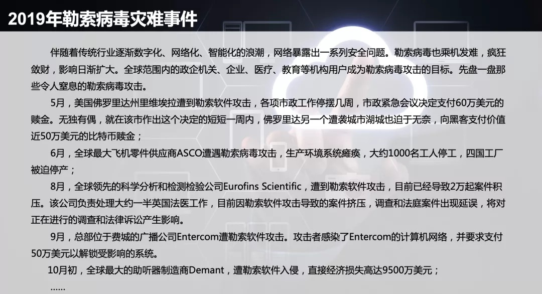 Since 2018, conventional blackmailing Trojan technology has become increasingly mature. The target of the attack has been changed from the initial large-area net indiscriminate attack to the precise attack of high-value targets. For example, direct attacks on the medical industry, servers of enterprises and institutions, government agencies, and traditional enterprises including the manufacturing industry are facing increasingly severe security situations.