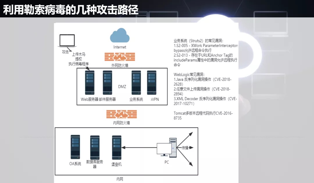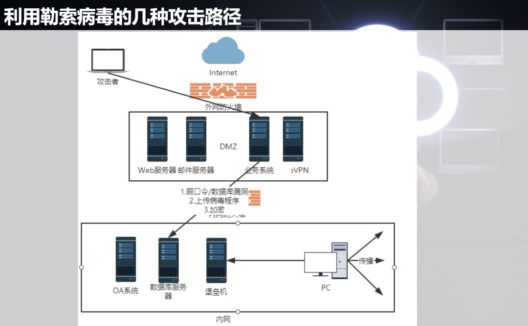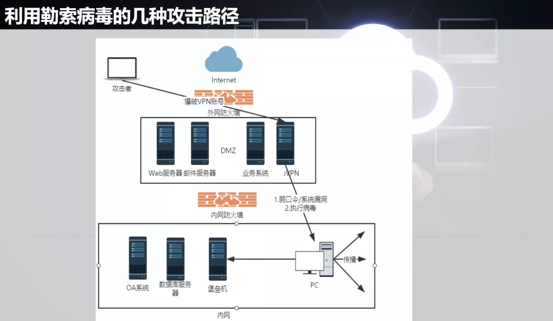 The attacker obtains the vpn account of corporate internal personnel through blasting and other methods, and scans the corporate intranet for system vulnerabilities/weak passwords. Once the user's host is not properly protected, it will be blackmailed.