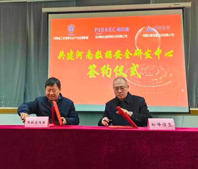 On November 14, Chen Yun, chairman of Hangzhou Palladium Network Technology Co., Ltd. (hereinafter referred to as Palladium), the governing unit of Henan Industrial Information Security Industry Development Alliance, led a team to Henan Songfeng Information Technology Co., Ltd. (hereinafter referred to as Songfeng Information), the governing unit of the alliance, for an exchange and discussion, and signed a strategic cooperation agreement with Gao Bin, chairman of Songfeng Information, to jointly build Henan Data Security R&D Center and establish a joint venture company, Zhengzhou Hanling Information Technology Co., Ltd.