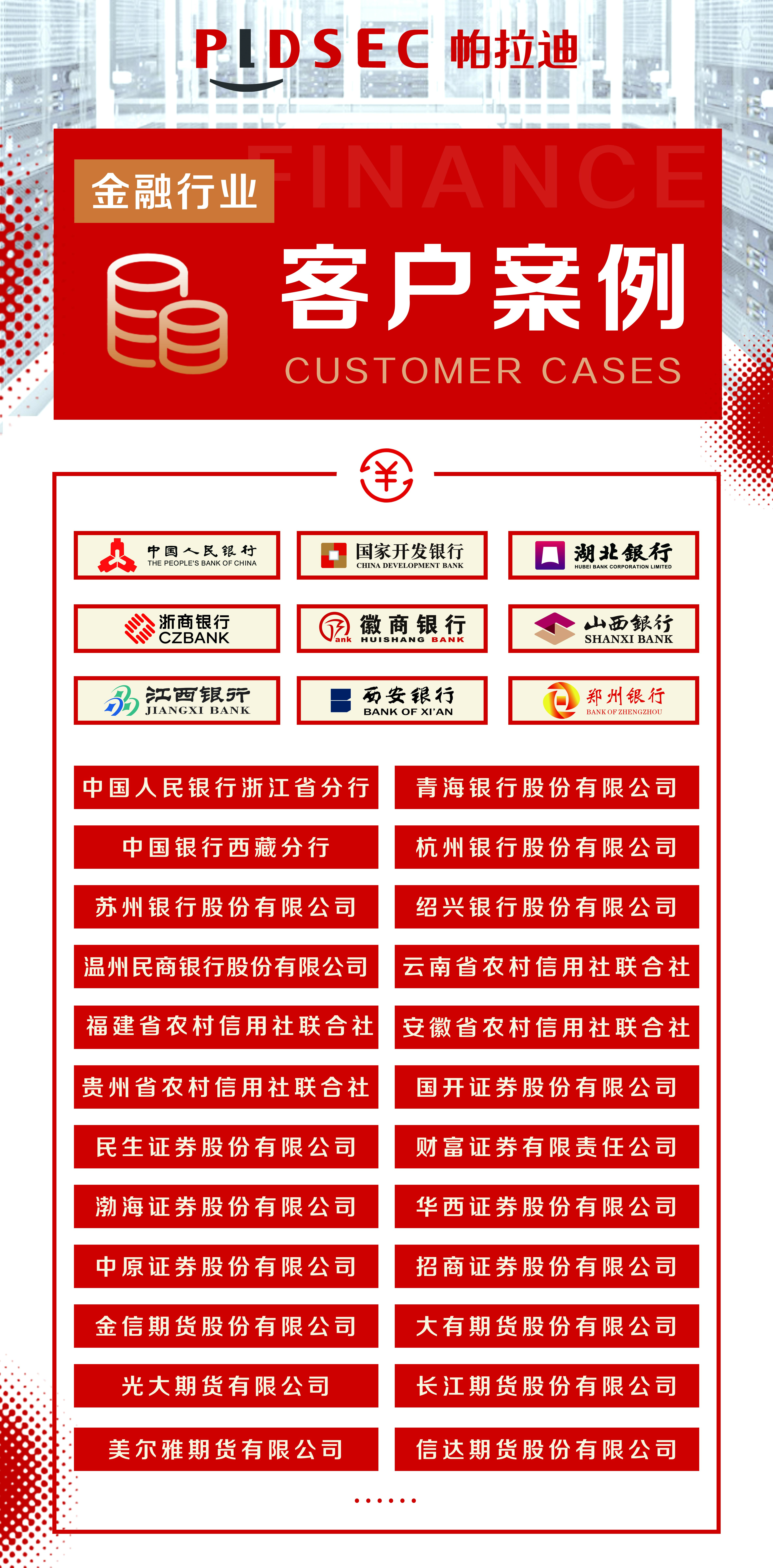 Over the years, Palladium has closely followed the cybersecurity scenarios of the financial industry and created professional and customized security practice solutions, providing important assistance for the digital intelligence business security and continuous improvement of efficiency of customers in the financial industry, and has successfully empowered the digital transformation of hundreds of leading financial customers such as banks, securities, insurance, funds, and futures.