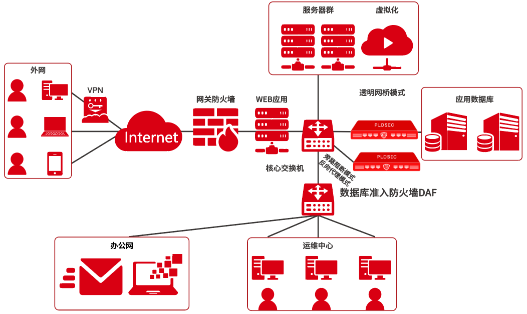 Palladium database access firewall, referred to as DAF (database access firewall), prevents the threat of illegal access and operation of database server in the internal network. For illegal access, strict access matching rules are formulated through the combination of built-in network firewall and access firewall. The matching range is from network layer to application layer. Illegal access requests are rejected, which greatly improves the access security of database server.